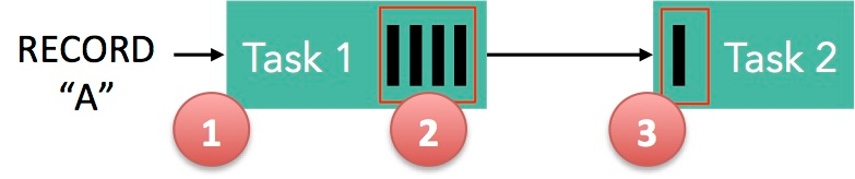 记录“A”进入了 Flink 并且被 Task 1 处理。(这里省略了 Netty 接收、反序列化等过程)